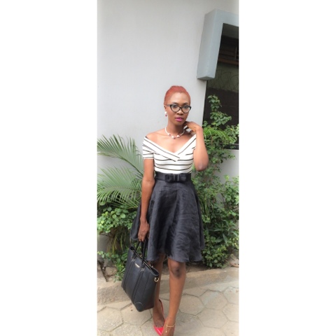 Got this black flared skirt and decided to match it with this striped off shoulder top. Didn't want anything heavy so I decided to use this beautiful necklace set to spice up my outfit.  And as for my hair I packed it and chai, I'm loving my red hair more and more by the minute.